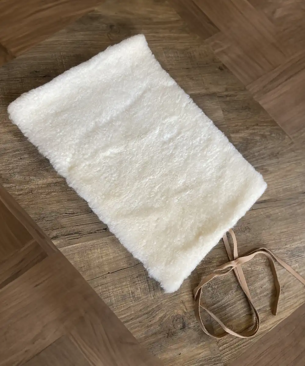 Wanderkissen aus geschorenem Fell mit Filz und Lederband